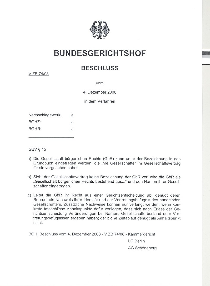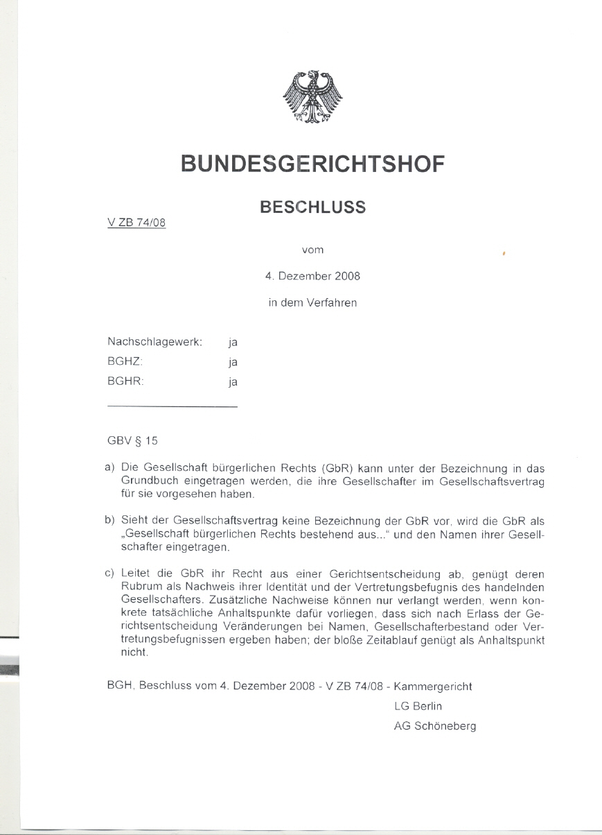 haben die BGH-Richter durch VB 74/08 die Grundbuchfähigkeit der GbR festgestellt.