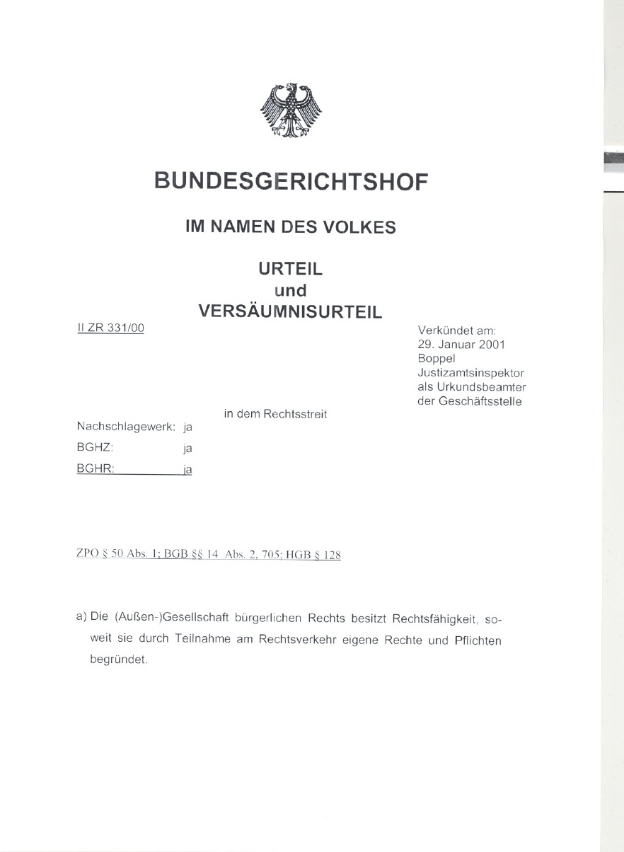 haben die Richter des II. Zivilsenats Röhricht, Henze, Goette, Kurzwelly, Münke in ihrem Urteil BGH II ZR 331/00 die Rechts-, Parteifähigkeit der GbR festgestellt.