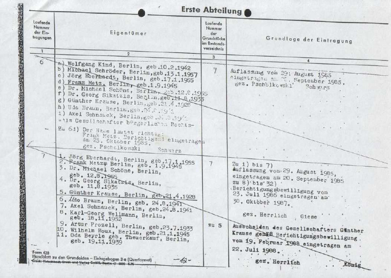 Am 2.11.1994 haben die Rechtspfleger Voß und König die 26. Hanseatische Grundbesitz GmbH, den RA Dr. Mosch und die Lederwerke Wieman GmbH (in GbR zu 1/1 Anteil) gelöscht und die 58. Hanseatische Grundbesitz GmbH & Co. KG als Alleineigentümerin der Grundstücke Kurfürstendamm 12 und 15 eingetragen, und zwar aufgrund der vom Notar Lafrentz beurkundeten Einigung, Auflassung vom 21.12.1993 [3.531 KB]
