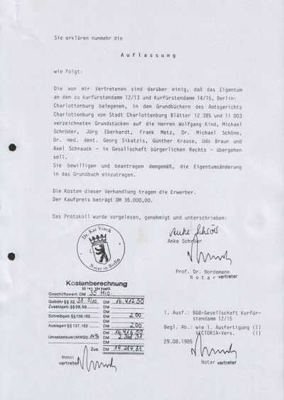 haben die VICTORIA-Lebensversicherungs-AG und die "GbR Kurfürstendamm 12-15", bestehend aus Kind, Schröder, Eberhardt, Metz, Schöne, Sikatzis, Krause, Braun und Schnauck einen Kaufvertrag über die Grundstücke Kurfürstendamm 12/13 und 14/15, Flurstücke 20/29 und 17/35 zum Kaufpreis von 35 Mio. DM geschlossen und vom Notar Dr. Vinck beurkunden lassen.