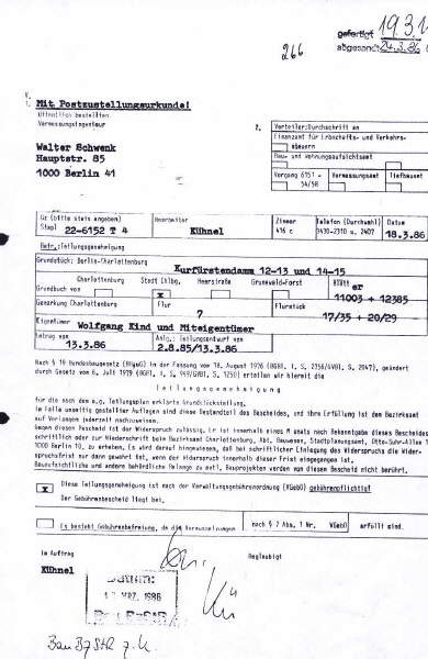 Der CDU-Bausenator Franke hat anschließend mit der Deckung durch den Regierenden Bürgermeister Diepgen und der weiter zuständigen Senatoren gegenüber seinen Untergebenen beim Bezirksamt Ch-burg Dienstanweisungen erteilt, im Zusammenhang mit den Grundstücken Kurfürstendamm 12/13 und 14/15 zu Gunsten von Gädeke und Landsberg sowie des inhaftierten Kind und zu Lasten der 9 Eigentümer (in GbR) und des Landes Berlin tätig zu werden und ist erst anschließend am 18.4.1986 von seinem Posten zurückgetreten.